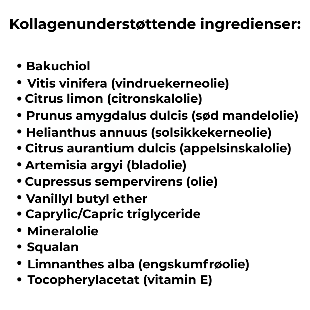 - Vindruekerneolie (naturlig): Vist i en klinisk undersøgelse (J Cosmet Dermatol, 2022;21:2600–2608) at forbedre hudens elasticitet og hydrering samt bidrage til en mere jævn hudtone og blødere, glattere hud.